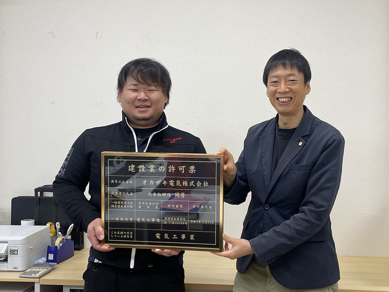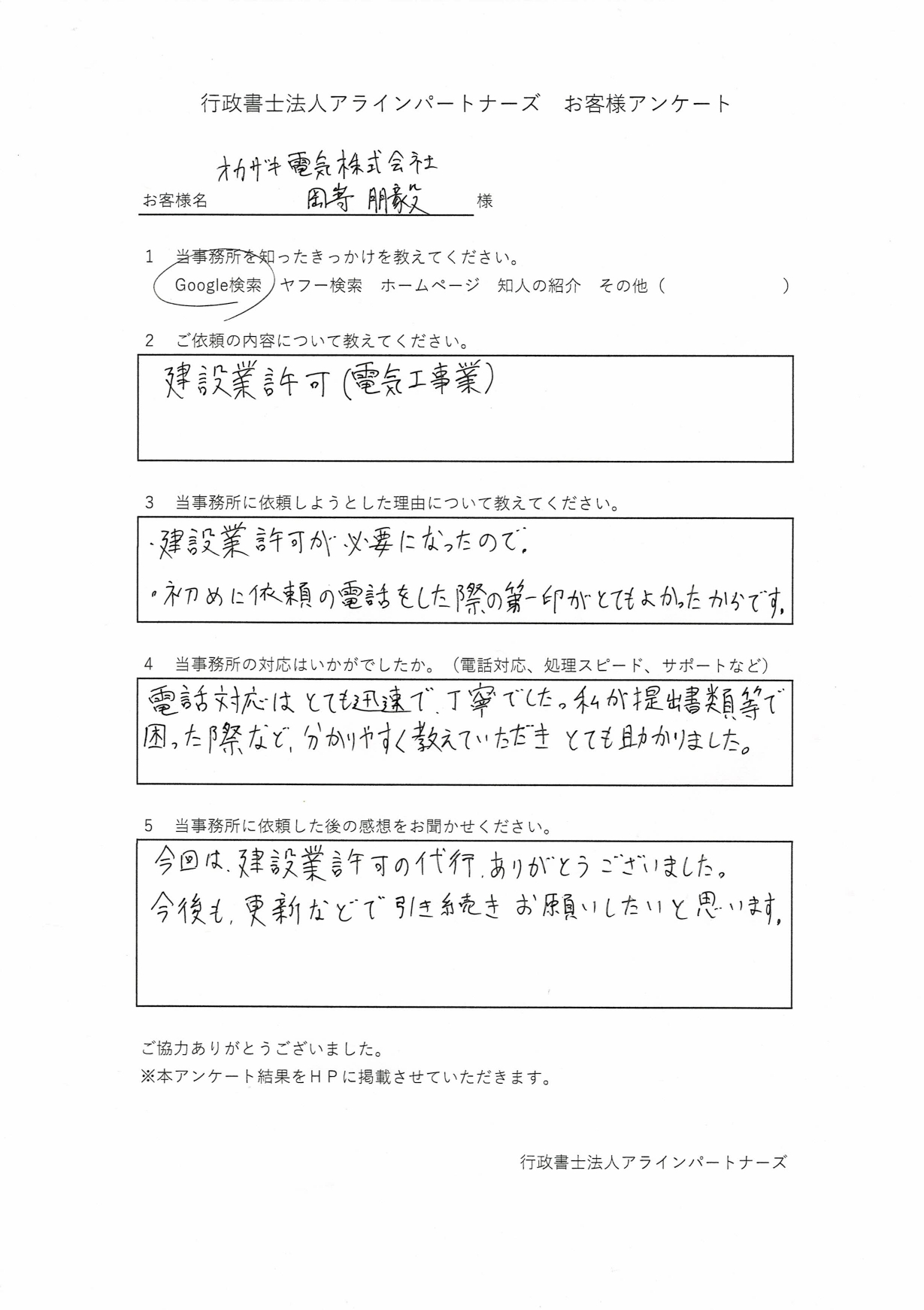 今回は、建設業許可の代行ありがとうございました。今後も、更新などで引き続きお願いしたいと思います。