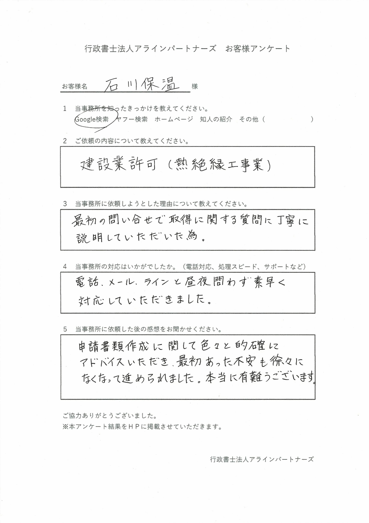 申請書類申請に関して色々と的確にアドバイスいただき、最初あった不安も徐々になくなって進められました。本当に有難うございます。